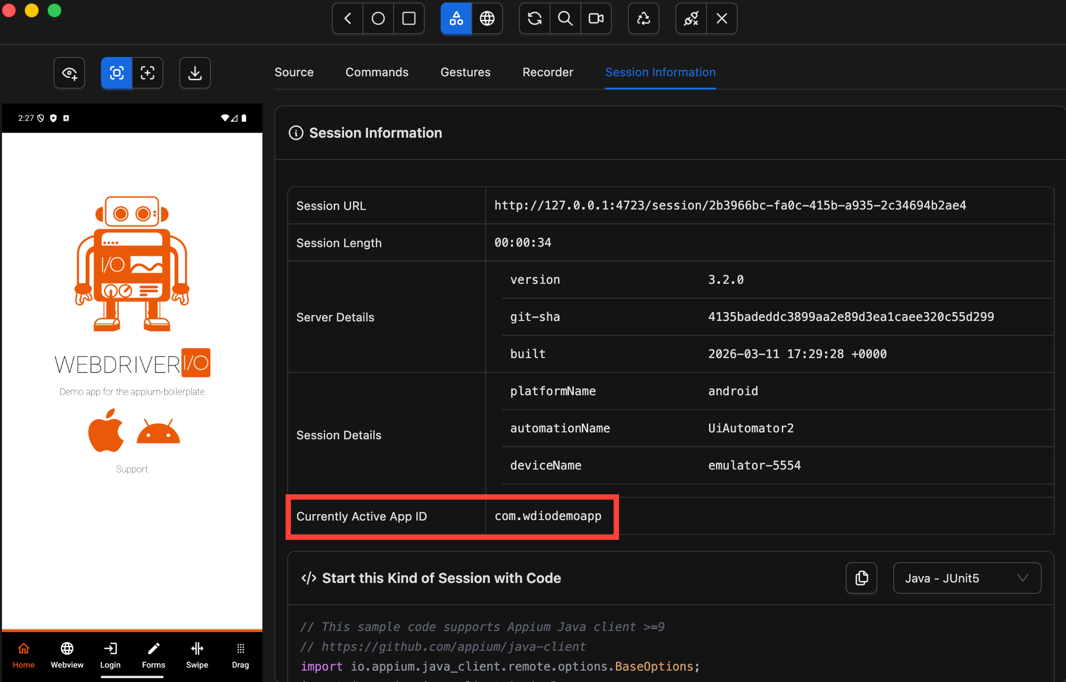 For appPackage, the easiest way is Appium Inspector — once a session is running, look at the Session Information panel where you'll see it listed as "Currently Active App ID" (com.wdiodemoapp for the demo app).
