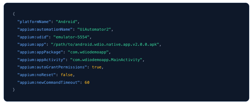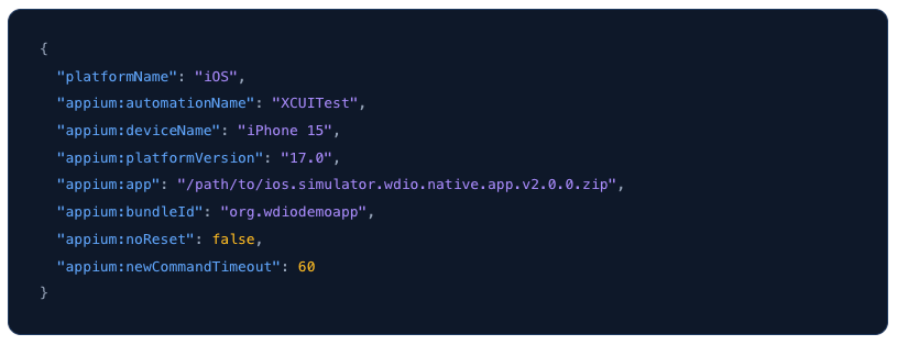 💡 Note: Both drivers also support aplatformVersioncapability — for example "15.0" for iOS or "14" for Android. It's used for device autodetection whenudidis not set. If you've already setudid, it's optional — but including it makes your configuration more explicit and easier to read for anyone maintaining the tests later.