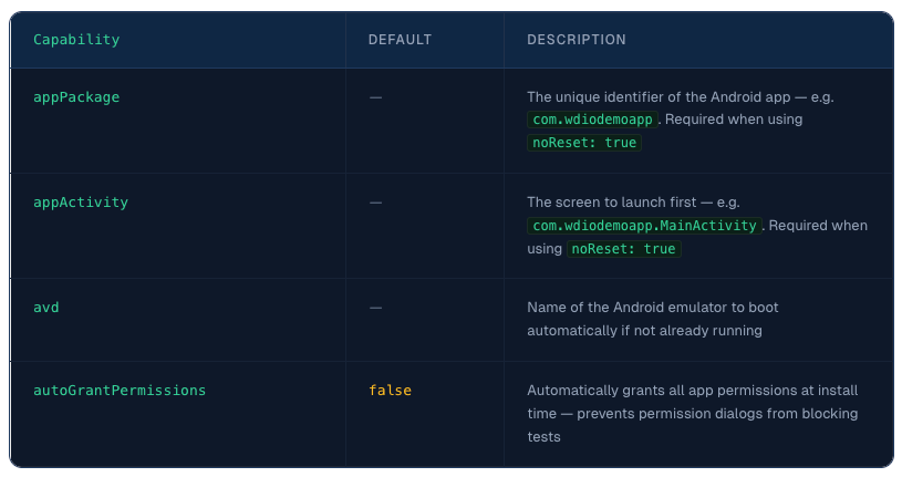 ✅ Why it matters: Unlike udid or deviceName, avd is the only capability that can actually start an emulator for you. If you want Appium to boot the emulator as part of your session setup rather than having to launch it manually first, this is the capability to use.