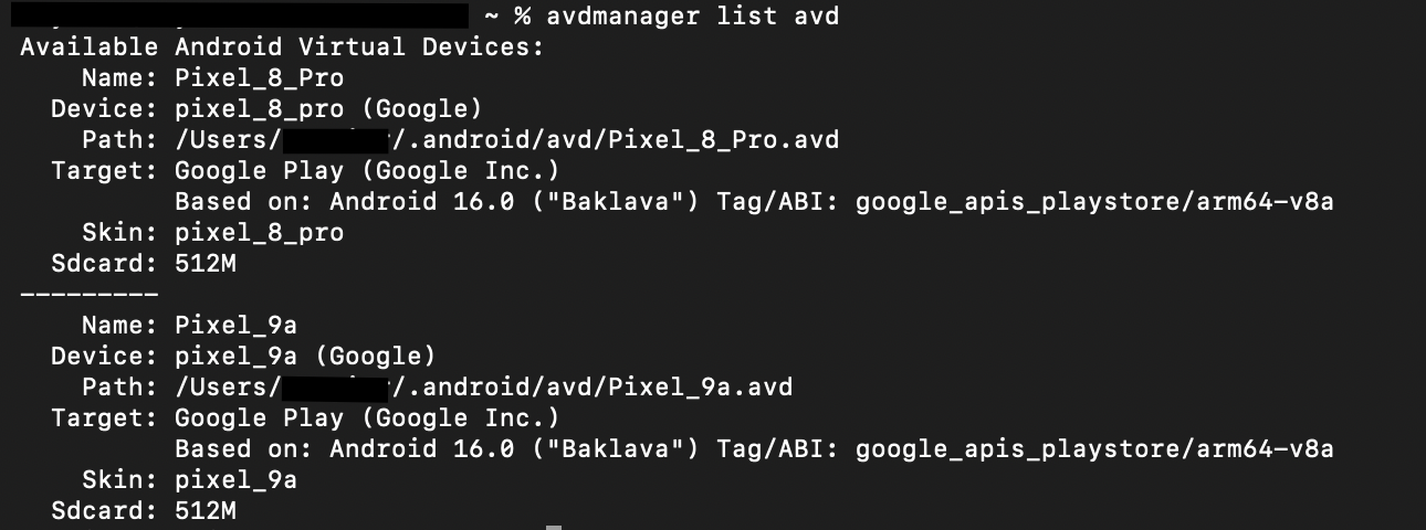 💡 How to find your AVD name: Run avdmanager list avd in Terminal. This lists all the emulators you have already set up on your machine — the name shown there is exactly what you pass to this capability. If the emulator you want isn't listed, you'll need to create it first through Android Studio's AVD Manager.⚠️ Note:avdis for emulators only and has no effect on real devices. For real Android devices, simply connect your device via USB with USB debugging enabled — then useudidto target it precisely.