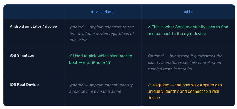 💡 Tip: If you're just getting started with a single emulator or simulator,deviceNameis fine for now. But as soon as you move to real devices, CI environments, or parallel testing, always setudidto guarantee Appium connects to the right device.
