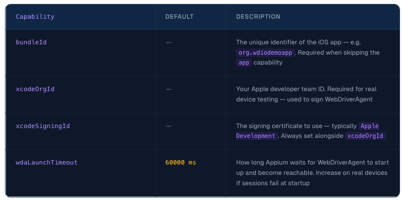 ⚠️ Note: These capabilities are only needed for real devices. On a simulator, Apple does not require code signing — Appium handles everything automatically and these can be omitted.