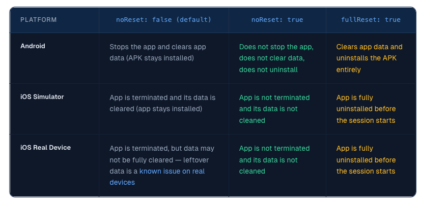 ✅ When to use noReset: false (default): When you need a clean slate for every test. On Android, the app stays installed but its data is cleared. On iOS simulators, the app is terminated and its data is cleared. On iOS real devices, the app is terminated but data may not always be fully cleared — this is a known limitation acknowledged in the official XCUITest driver documentation. If clean state is critical on real devices, consider using fullReset: true instead.