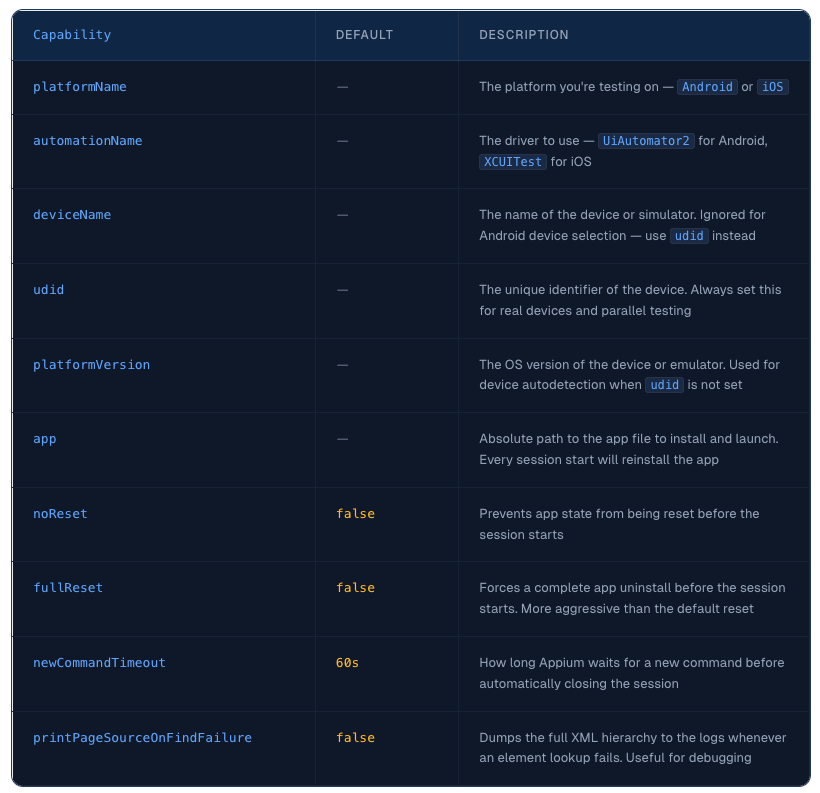 You now have a solid understanding of Appium capabilities — what they do, when to use them, and how to put them together into a working session configuration for both Android and iOS.