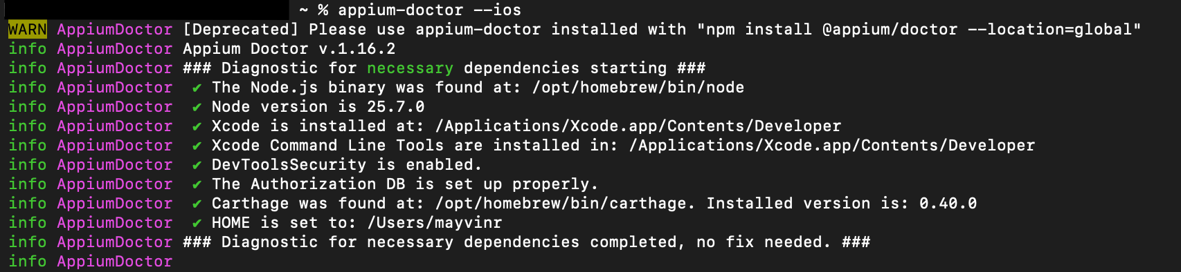 As a final step, you can use Appium Doctor to ensure that your iOS environment is correctly configured. Run the following command in your terminal: