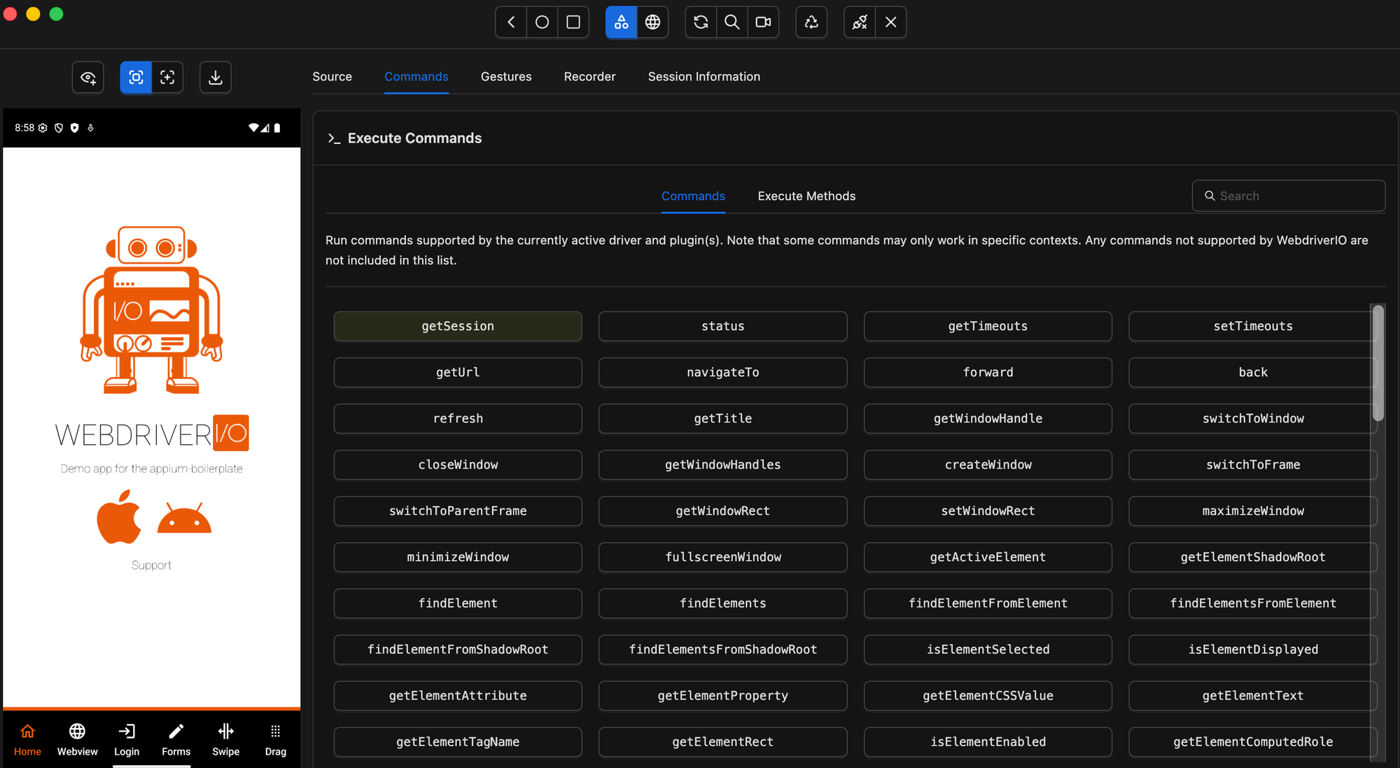 The Commands tab gives you a way to run Appium driver commands and execute methods directly from the Inspector interface — without writing any code.
