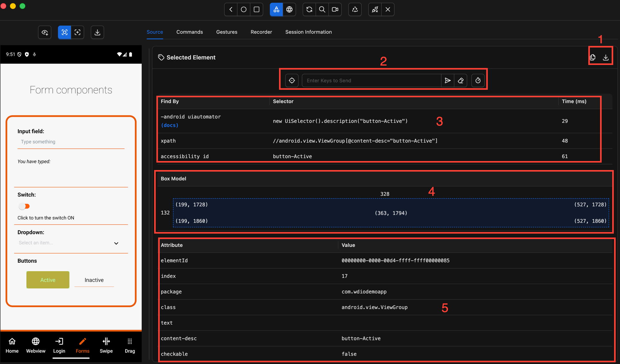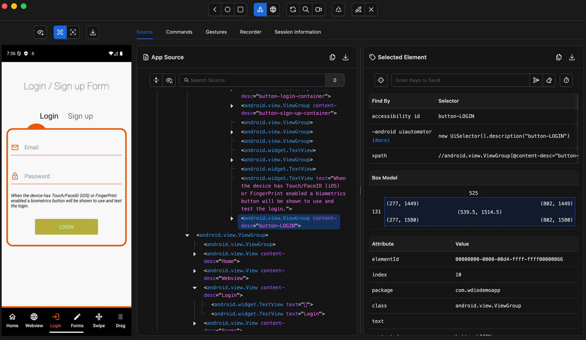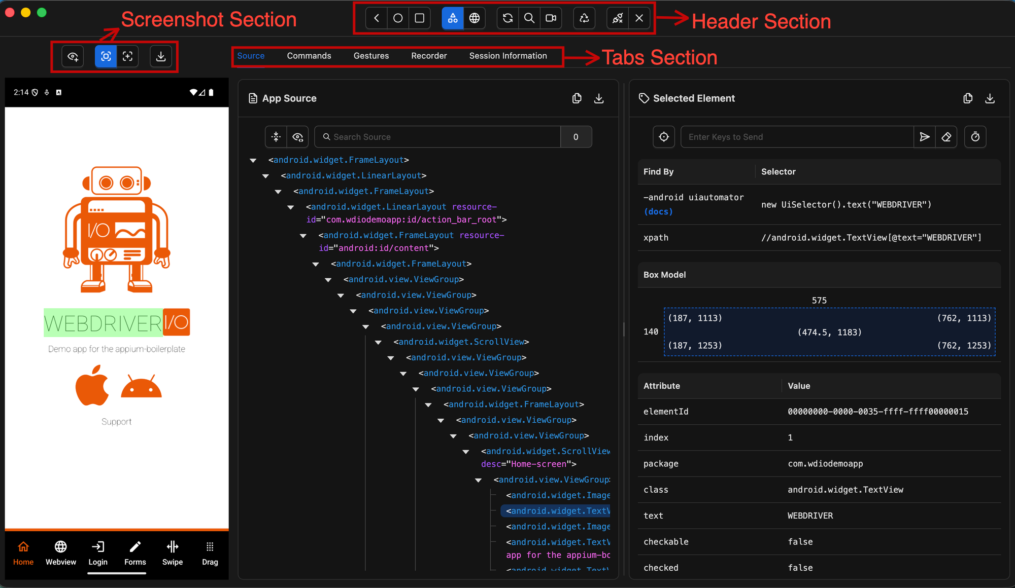 - Tabs — provides access to the App Source (element hierarchy), Element Properties, and additional features such as Gestures, Recorder, and Commands
