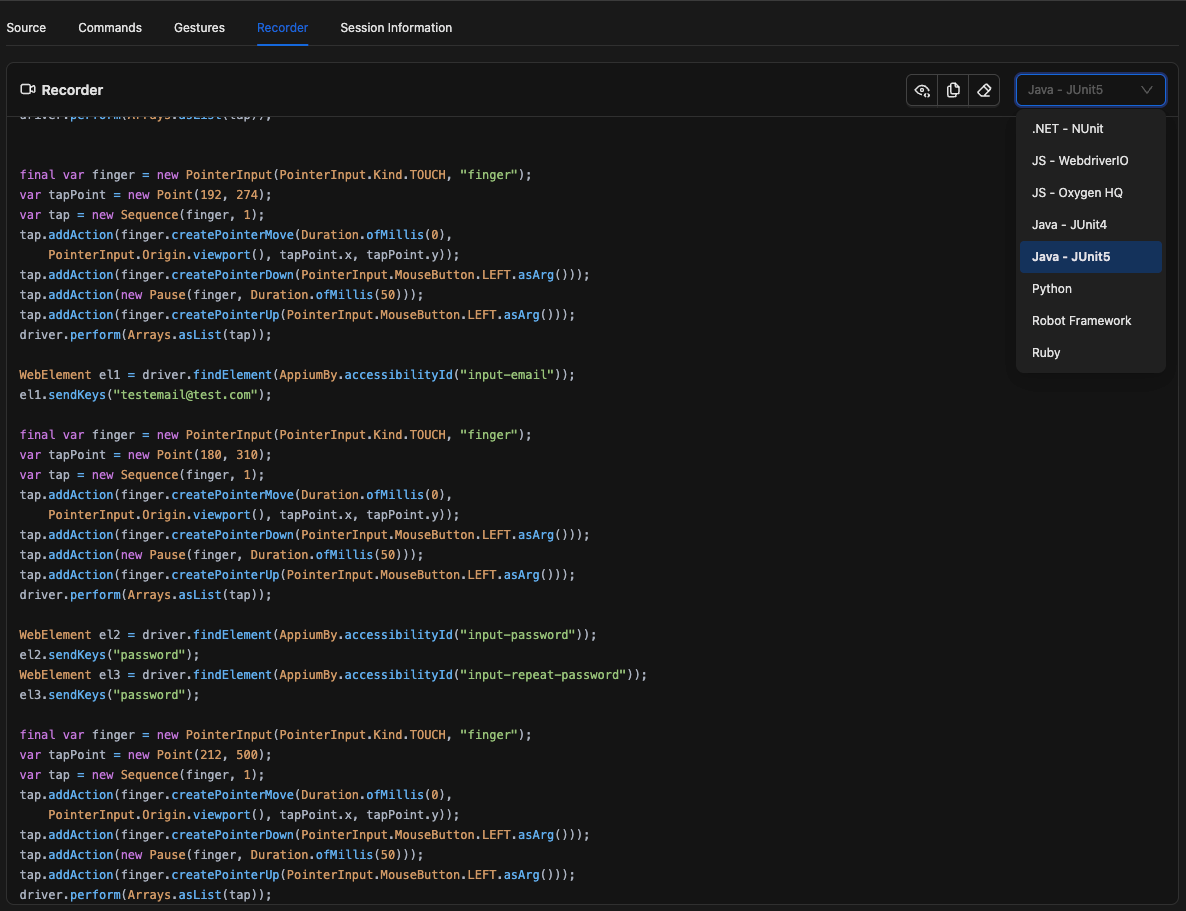 The Recorder tab automatically converts your interactions with the app into ready-to-use Appium client code — saving you the effort of writing it from scratch. It supports multiple programming languages, so regardless of whether you are using Java, Python, JavaScript, or another supported language, the generated code will be ready to copy directly into your test project.