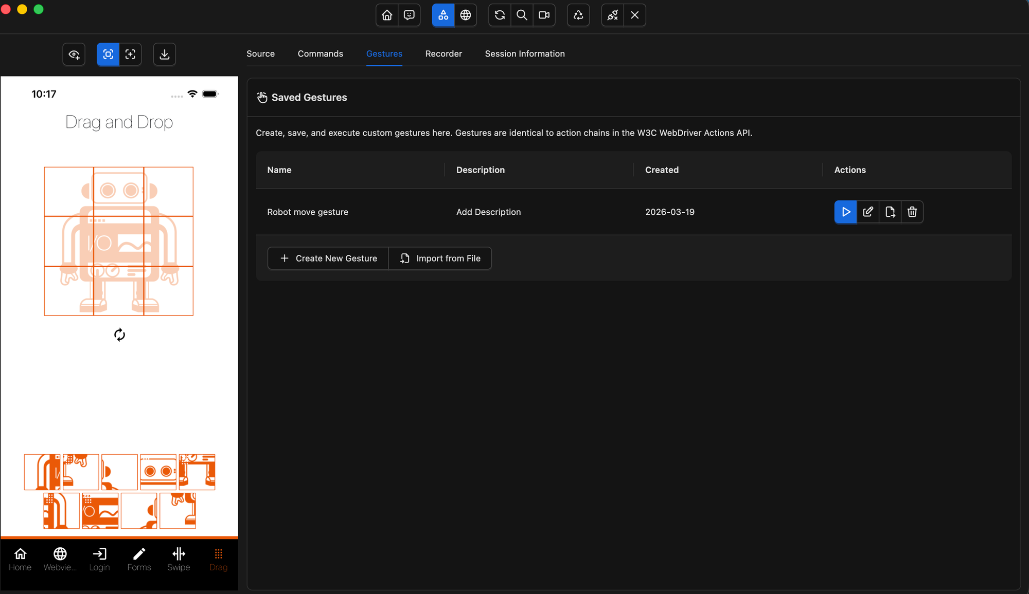 The Gestures tab is where you can create, save, and execute custom touch gestures — without writing any code. This is particularly useful when you need to test interactions like swipes, pinches, or multi-step drag actions before implementing them in your automation scripts.