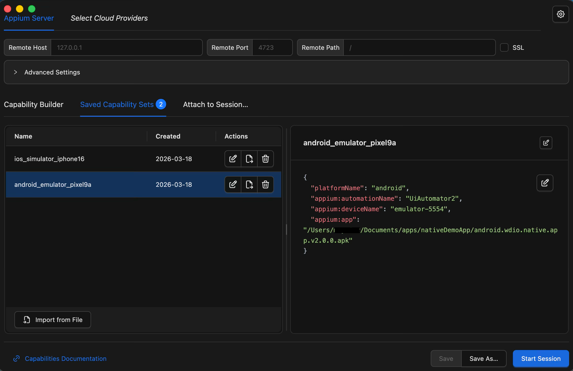 To launch a saved session, navigate to the Saved Capability Sets tab and select the capability set you saved previously. If you haven't saved one yet, you can do so by entering your desired capabilities under the Capability Builder tab and clicking Save As… at the bottom — give it a name so you can reuse it later.