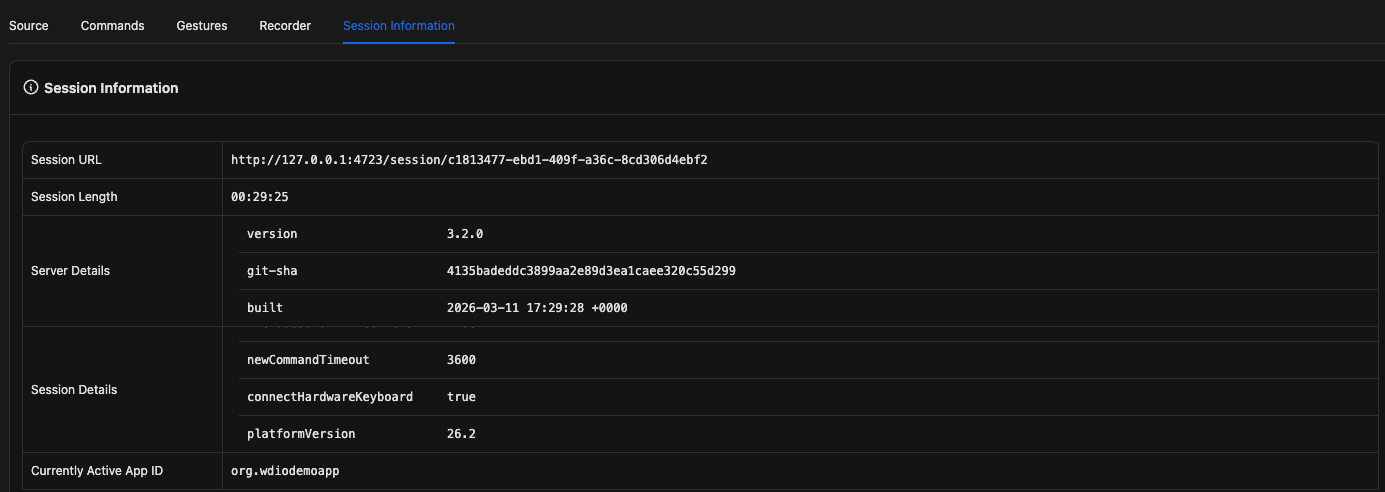 The Session Information tab gives you a quick overview of your current Appium session. It’s useful when you want to understand how your session is configured or reuse that configuration in your tests.