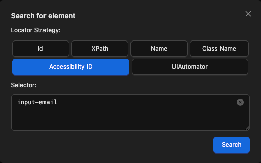 - Selector String — the value to search for, based on the chosen locator strategy (e.g. an accessibility ID value or an XPath expression)