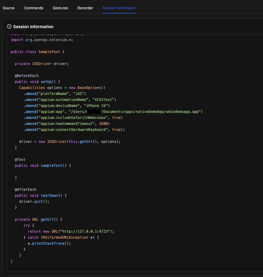 If your session is working correctly in Appium Inspector, you can copy the boilerplate code to quickly replicate the same setup in your test project.