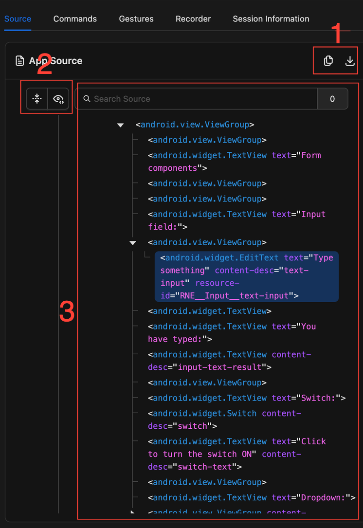- Source tree — the element hierarchy generated from the XML data returned by the Appium driver. By default, each element entry displays its class name along with a selection of important attributes such as