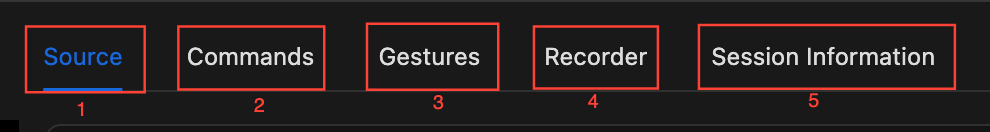 The Tabs section consists of five tabs: Source, Commands, Gestures, Recorder, and Session Information. Let's walk through each one.